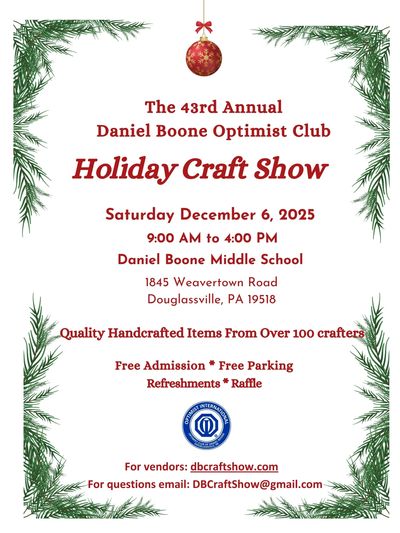 Come join us at our 43rd Annual Holiday Craft Show Dec 6, 2025, 9:00 AM to 4 PM at the Daniel Boone Middle School, 1845 Weavertown Road, Douglassville, 19518.