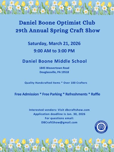 Come join us at our 29th Annual Spring Craft Show March 21, 2026, 9:00 AM to 3 PM at the Daniel Boone Middle School, 1845 Weavertown Road, Douglassville, 19518.